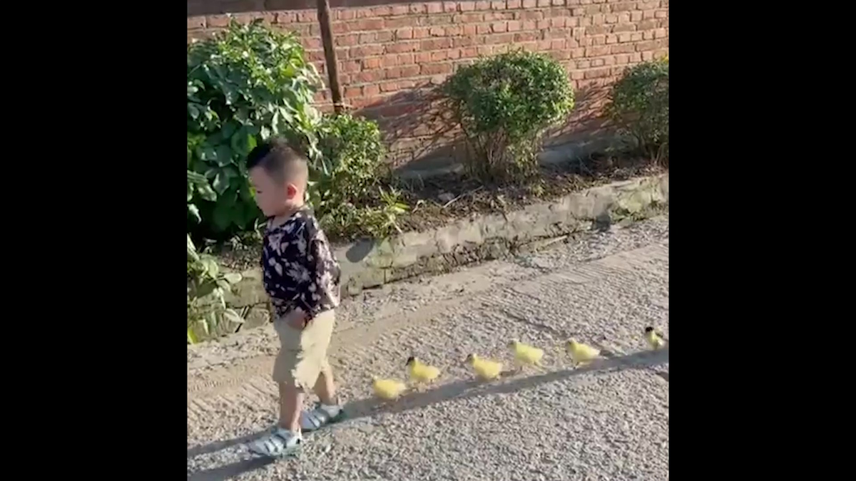 Chết cười xem cậu bé làm 'đại ca' của đàn vịt con