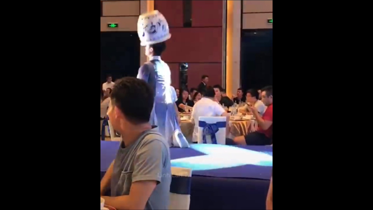 Người xem clip không khỏi trầm trồ khi chàng trai dùng đầu đỡ chậu hoa rồi bật cười khi chậu họa ụp thẳng xuống mặt anh.