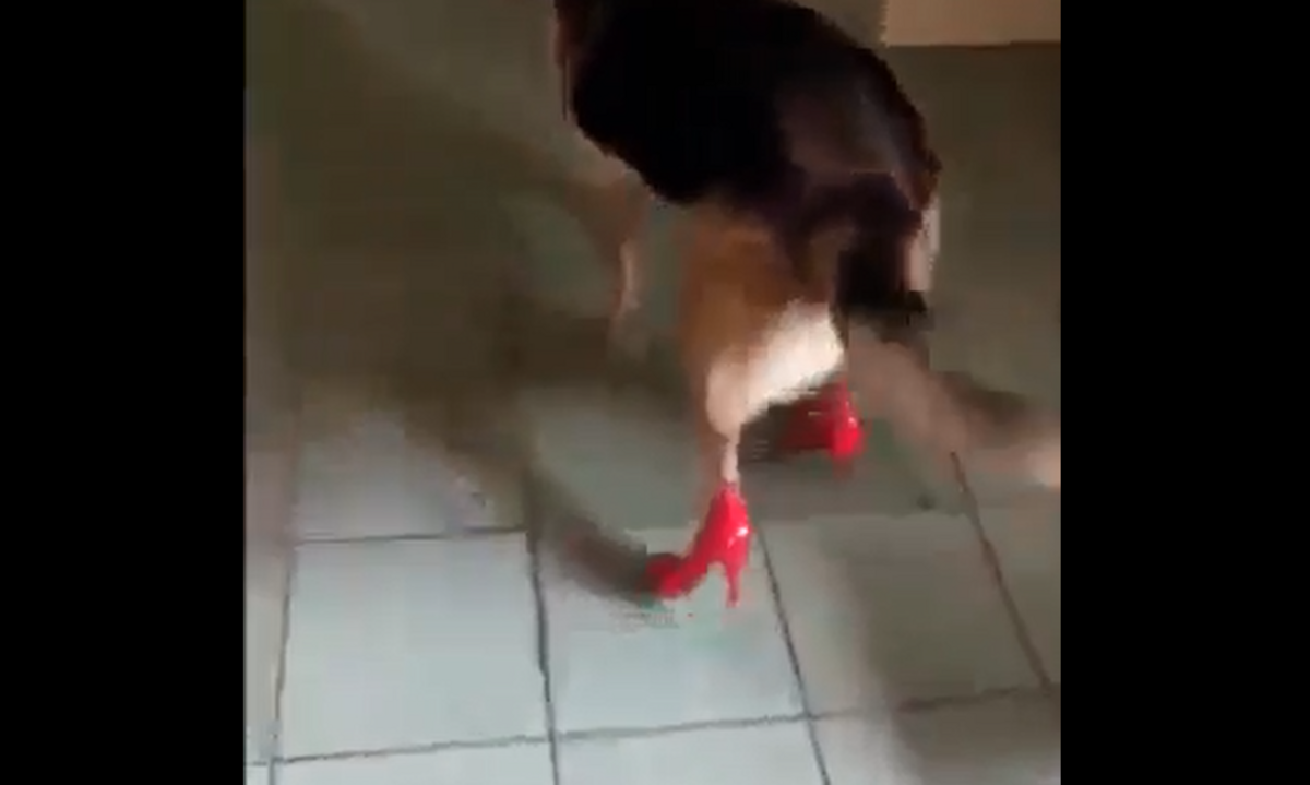 Được sắm cho đôi giày cao gót đỏ chót, chú chó tập tễnh đi một vòng khiến mọi người không nhịn được cười.