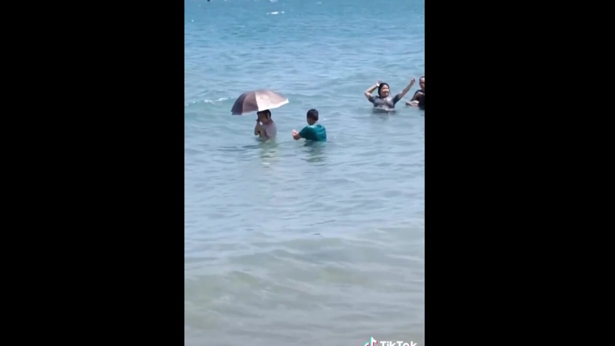 Sợ nắng đen da, cô gái dùng ô che khi dầm mình dưới biển khiến mọi người buồn cười.