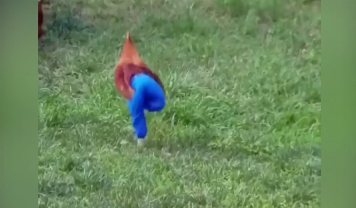 Hình ảnh chú gà mặc quần chạy loăng quăng, trông giống như một anh chàng còng lưng khiến người xem không nhịn được cười.