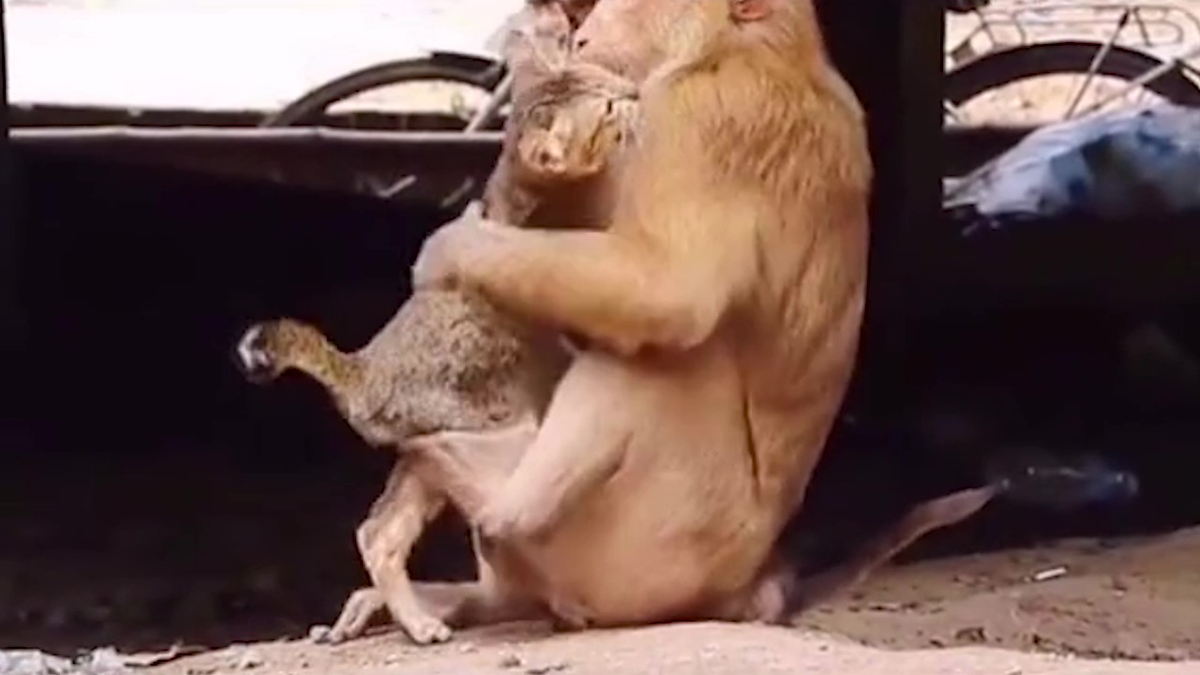 Chú mèo tỏ vẻ sợ hãi khi bị khỉ lôi kéo, nhưng vì quá bé nhỏ nên chẳng thể làm được gì, bị khỉ cưỡng ép ôm vào lòng.