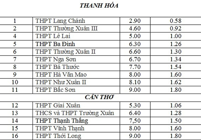 Điển hình như trường THPT Lang Chánh có điểm chuẩn là 2,9 điểm. Như vậy thí sinh chỉ cần đạt trung bình 0,58 điểm/môn đã trúng tuyển. Hàng loạt các trường khác cũng có điểm chuẩn “cận đáy” như trường THCS-THPT Quan Sơn, Trường THPT Nga Sơn, Trường THPT Lê Lai...