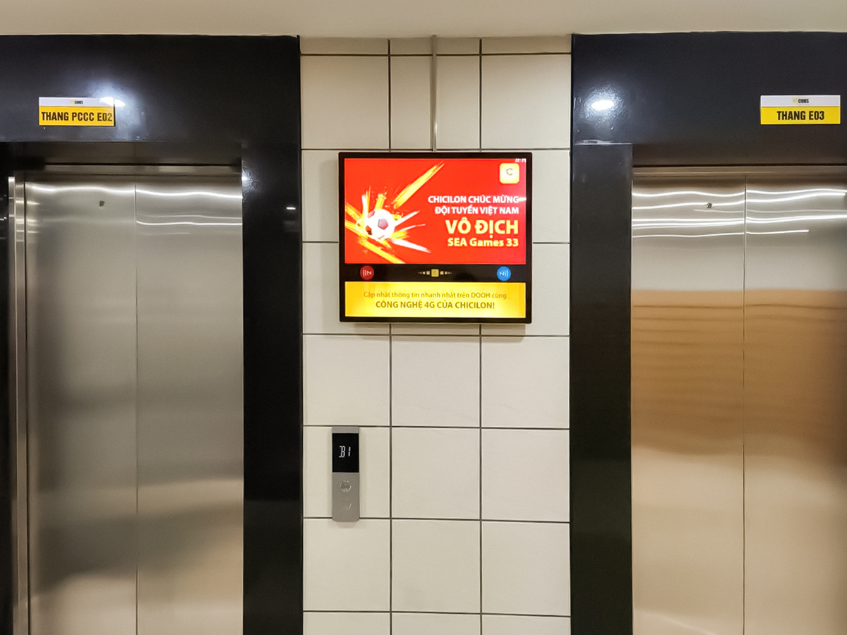 Chỉ trong 19 phút sau khi trận chung kết SEA Games 33 khép lại, màn hình thang máy hiển thị nội dung chúc mừng đội tuyển bóng đá Việt Nam.