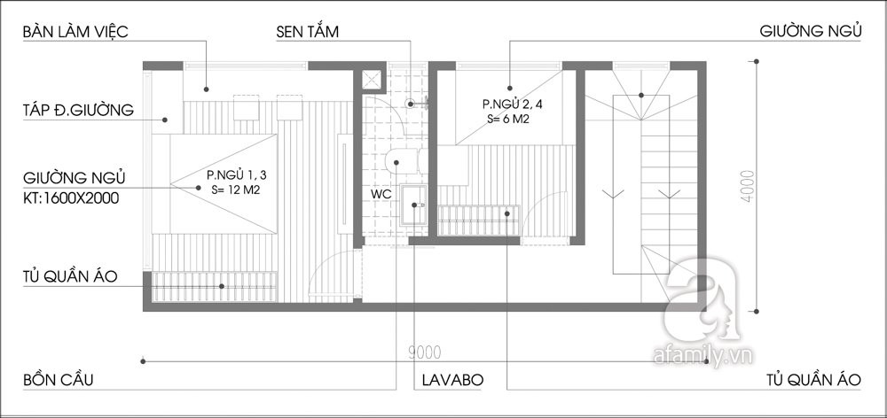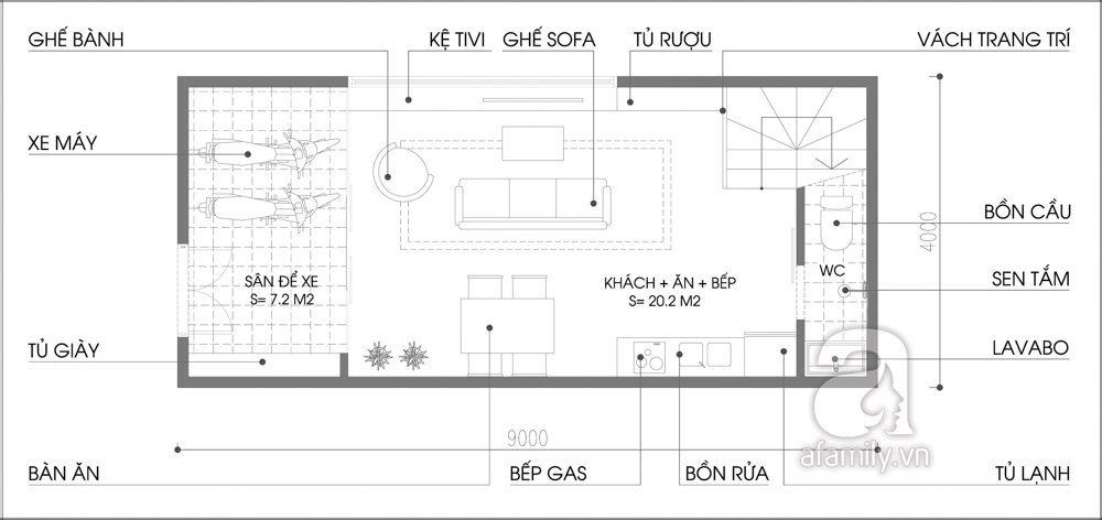 Chi tiết cách bố trí không gian được phác họa như sau: