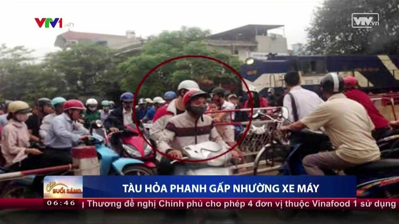 Tuy nhiên, lối thông quá hẹp khiến hàng chục người cùng xe máy mắc kẹt trên đường ray. Trong khi đó, đoàn tàu hàng đang băng tới.