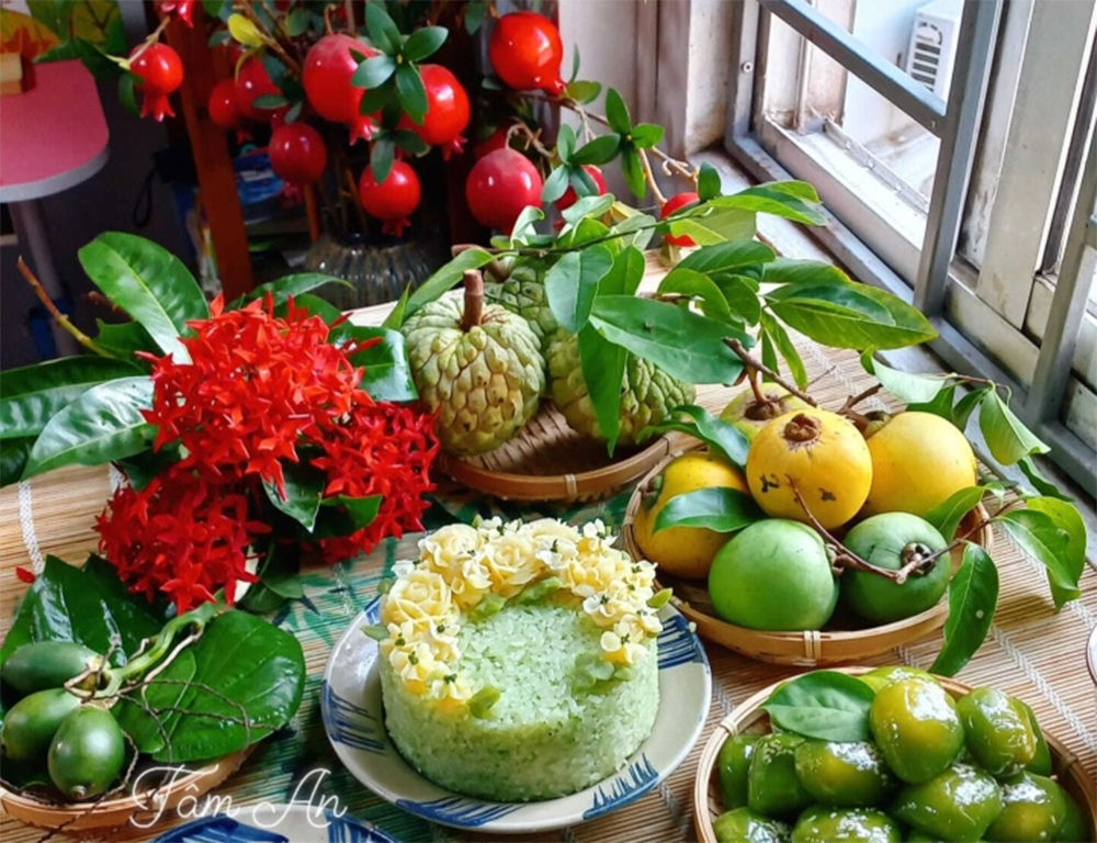 Chị Loan Trần (Hà Nội) kỳ công chuẩn bị hoa thơm quả đẹp cùng một mâm cỗ chay đẹp mắt để cúng mùng 1 tháng 7 Âm lịch.