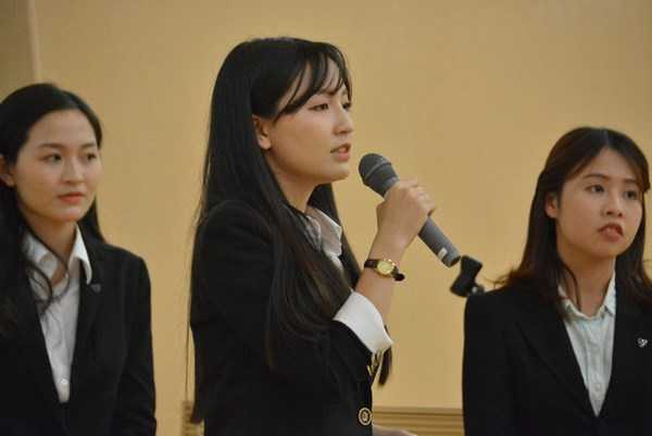 Huyền Trang đại diện nhóm thuyết trình ý tưởng phát triển ẩm thực Việt tại Nhật trước BGK.