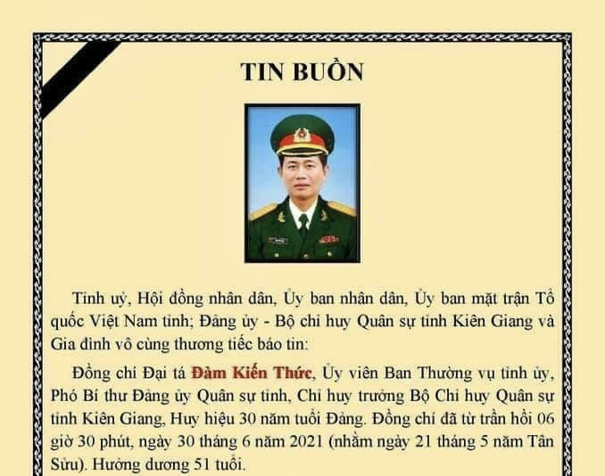 Chiều 30/6, Bộ Chỉ huy Quân sự tỉnh Kiên Giang ra thông báo về việc Đại tá Đàm Kiến Thức (SN 1971), Ủy viên Ban Thường vụ Tỉnh ủy, Chỉ huy trưởng Bộ chỉ huy Quân sự tỉnh Kiên Giang từ trần do tai nạn giao thông.