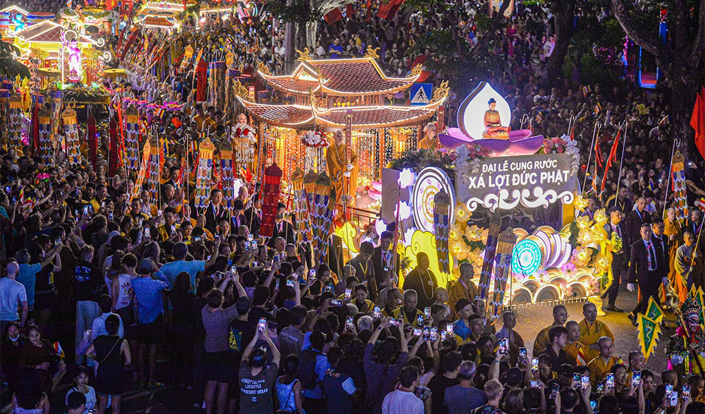Hàng vạn người dân và phật tử đổ về khu vực quanh hồ Hoàn Kiếm (Hà Nội) để cung rước và chiêm bái xá lợi Đức Phật tối 13/5.