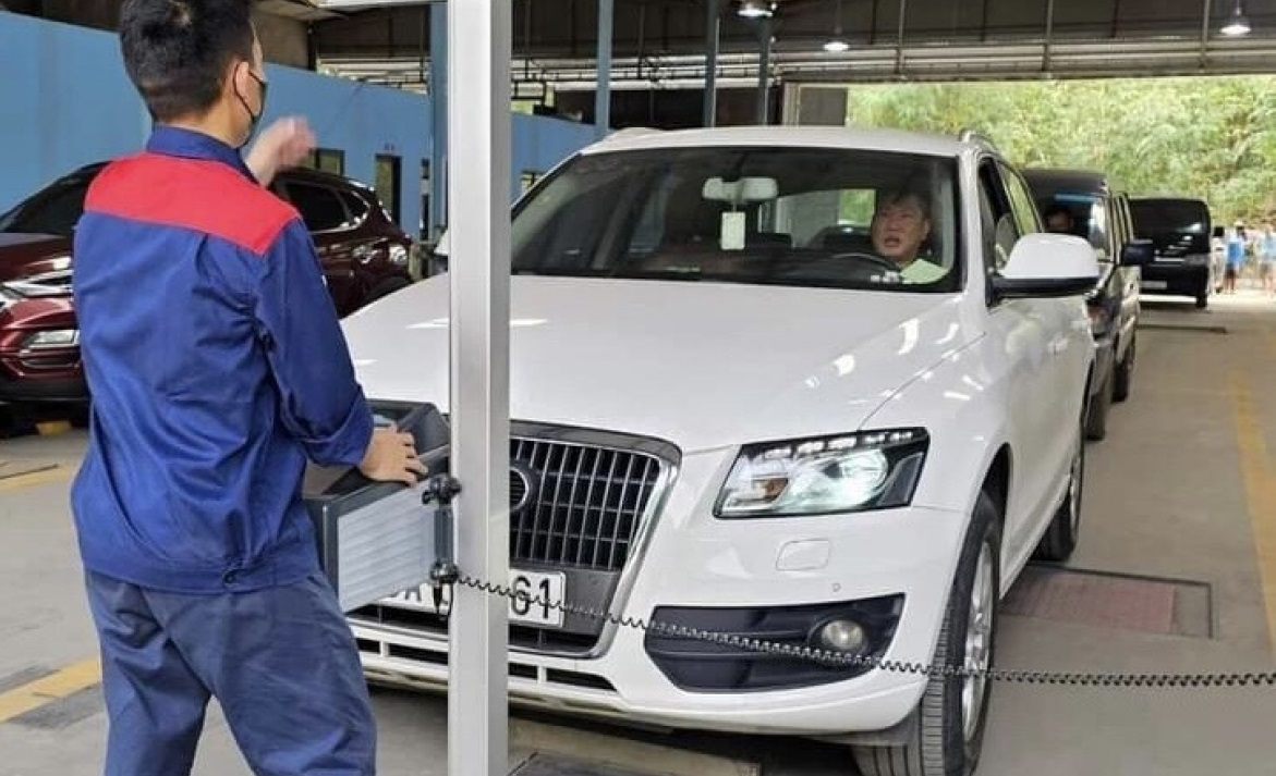 Nhân viên đăng kiểm thực hiện quy trình kiểm định xe cơ giới tại trung tâm đăng kiểm ở Hà Nội.