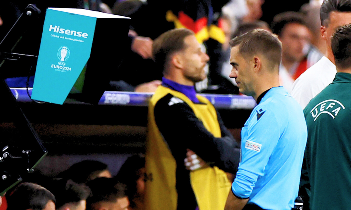 Phút 24 trận đấu giữa Đức và Scotland ở bảng F EURO 2024, Jamal Musiala (Đức) rê bóng lắt léo, trước khi bị tiền vệ Ryan Chritie và hậu vệ Kieran Tierney truy cản. Trọng tài chính Clement Turpin chỉ tay vào chấm 11m, cho tuyển Đức hưởng phạt đền.
