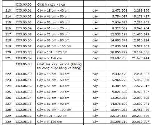 | Bảng chi phí chặt cây xà cừ theo quyết định 5875/QĐ-UBND về đơn giá thanh toán cho các sản phẩm dịch vụ công ích đô thị trên địa bàn Thành phố Hà Nội (đơn giá: đồng) |