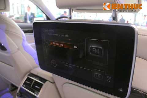| Trên bệ tì tay của 750Li ở hàng ghế sau là các phím điều khiển ghế ngồi, cùng với một chiếc máy tính bảng Samsung Galaxy Tab 4 7 inch có thể tháo rời đóng vai trò là hệ thống điều khiển BMW Touch Command, cho phép điều khiển tới 24 tính năng khác nhau trong xe như rèm cửa, đèn nội thất... |