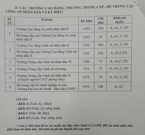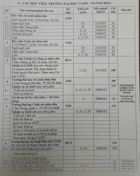 Sau đây là toàn cảnh chỉ tiêu tuyển sinh các trường CAND đối với các thí sinh khu vực các tỉnh phía Nam (từ Quảng Bình trở vào):