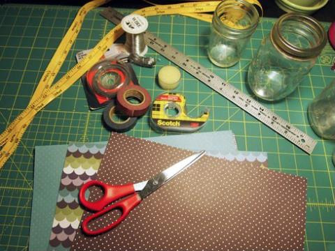 Bước 1: Cắt giấy màu thành hình chữ nhật, sao cho chiều rộng lớn hơn độ cao của lọ thuỷ tinh khoảng 4-6cm