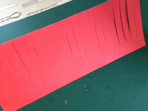 Bước 2: Gập đôi tờ giấy theo chiều rộng. Dùng bút chì vẽ những đường thẳng song song với mép giấy, khoảng cách giữa những đường thẳng khoảng 1 cm. Dùng kéo cắt theo các đường vừa kẻ để tạo thành những dải giấy, chừa lại 1 - 2 cm gần mép giấy không cắt.