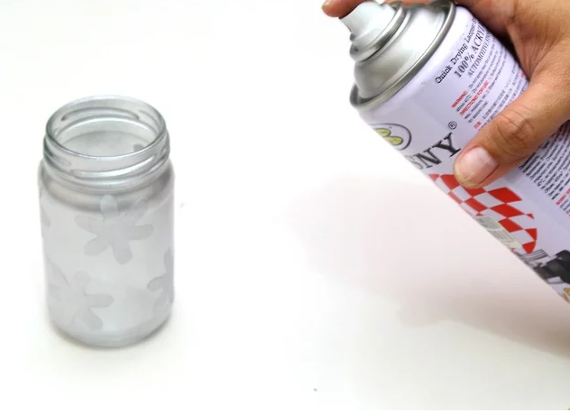 Bước 2: Phun sơn kín bề mặt lọ. Lưu ý, không để sơn dính vào mắt để bảo đảm an toàn nhé và tốt nhất là nên dùng sơn có màu tối.