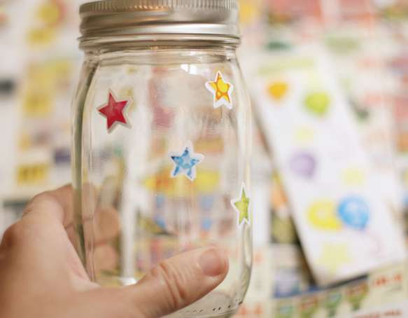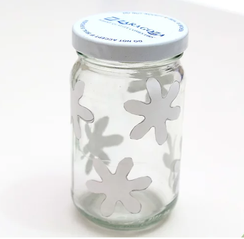 Bước 1: Vẽ tạo hình lên giấy, bạn có thể vẽ bất cứ họa tiết gì nếu muốn. Sau đó, dùng kéo cắt rời hình vừa vẽ ra, dán lên lọ thủy tinh. Nếu bạn không khéo tay lắm, bạn có thể mua những miếng sticker bán sẵn trên thị trường rồi dán lên lọ thủy tinh.