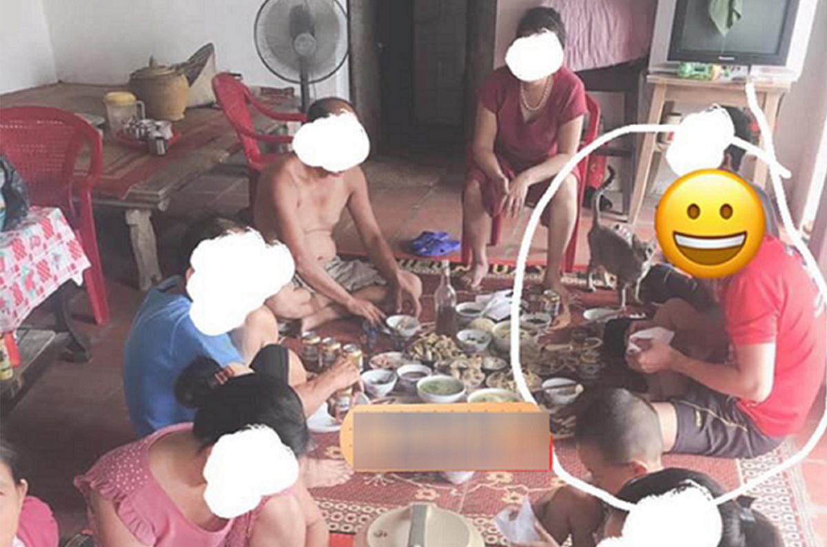 Kèm theo đó là bức hình cả gia đình đang ngồi ăn uống vui vẻ, thoải mái. Thanh niên mặc quần đùi áo phông, trong hình còn có nhiều người khác nam nữ đủ cả.