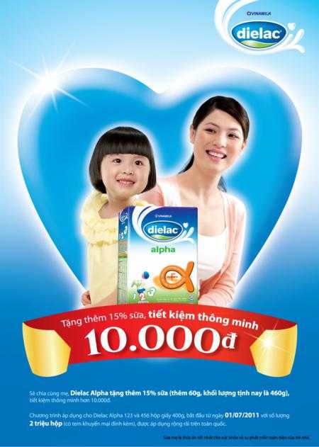 Theo đó, từ ngày 01/07/2011 các sản phẩm Dielac Alpha hộp giấy 400g có dán tem khuyến mại dành cho trẻ từ 1-3 & 4-6 tuổi sẽ được tăng thêm 15% trọng lượng (tương đương tăng thêm 60g sữa/hộp), với giá không đổi. Và như thế, các bà mẹ sẽ tiết kiệm được hơn 10.000đ mỗi hộp. Dự kiến, sẽ có 2 triệu hộp Dielac Alpha có trọng lượng tăng thêm 15%, tương đương giá trị tiết kiệm cho người tiêu dùng lên đến hơn 20 tỉ đồng trong suốt chương trình. Ngoài ra, Vinamilk cũng đang đi tiên phong tham gia chương trình “bình ổn giá” cho các sản phẩm sữa bột Dielac Alpha dành cho trẻ em dưới 1 tuổi và sữa bột Vinamilk Canxi dành cho người già, người lớn tuổi cho đến hết năm 2011 trong thời điểm giá cả tiêu dùng ngày càng tăng cao.