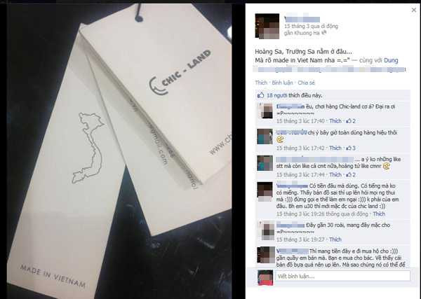 Một dân mạng đã đăng tải bức hình in nhãn mác thương hiệu Chic-land hàng 'made in VietNam', nhưng trong bản đồ quốc gia lại không có hai địa danh Hoàng Sa, Trường Sa.