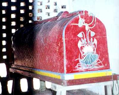 Qua vài lớp khóa, sau bao háo hức, rồi chúng tôi cũng được tận mắt chiếc bao quan kia. Ánh nắng le lói xuyên qua các ô thông gió soi rõ chiếc bao quan được để trên 2 chiếc ghế mà người địa phương gọi là bộ ngựa, có hình dáng giống một ngôi mộ mái vòm, sơn màu đỏ như máu, mặt trước của được vẽ hình hoa sen cách điệu.