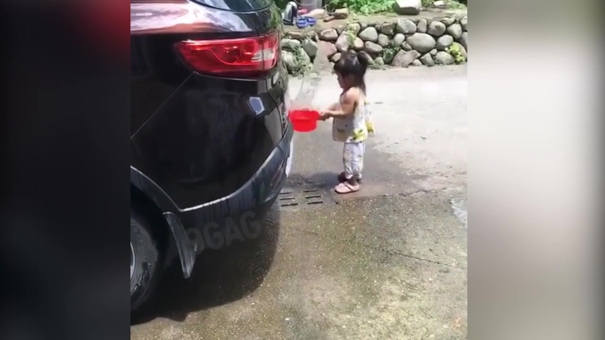 Bê gáo nước nặng nề ra rửa xe nhưng bé gái lại hất sai hướng khiến nước trong gáo đổ hết vào người.