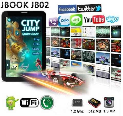 JBook JB02 là một trong số ít sản phẩm máy tính bảng nghe gọi giá rẻ được bộ truyền thông và thông tin chứng nhận, máy sở hữu màn hình 7 inches, hệ điều hành android, chip xử lý 1.2Ghz, bộ nhớ trong 8GB, hỗ trợ thẻ nhớ ngoài 32GB. JBook JB02 tương thích với hầu hết các nhà mạng di động tại Việt Nam. Chất lượng sóng tốt, màn hình hiển thị rõ nét, cảm ứng mượt mà.