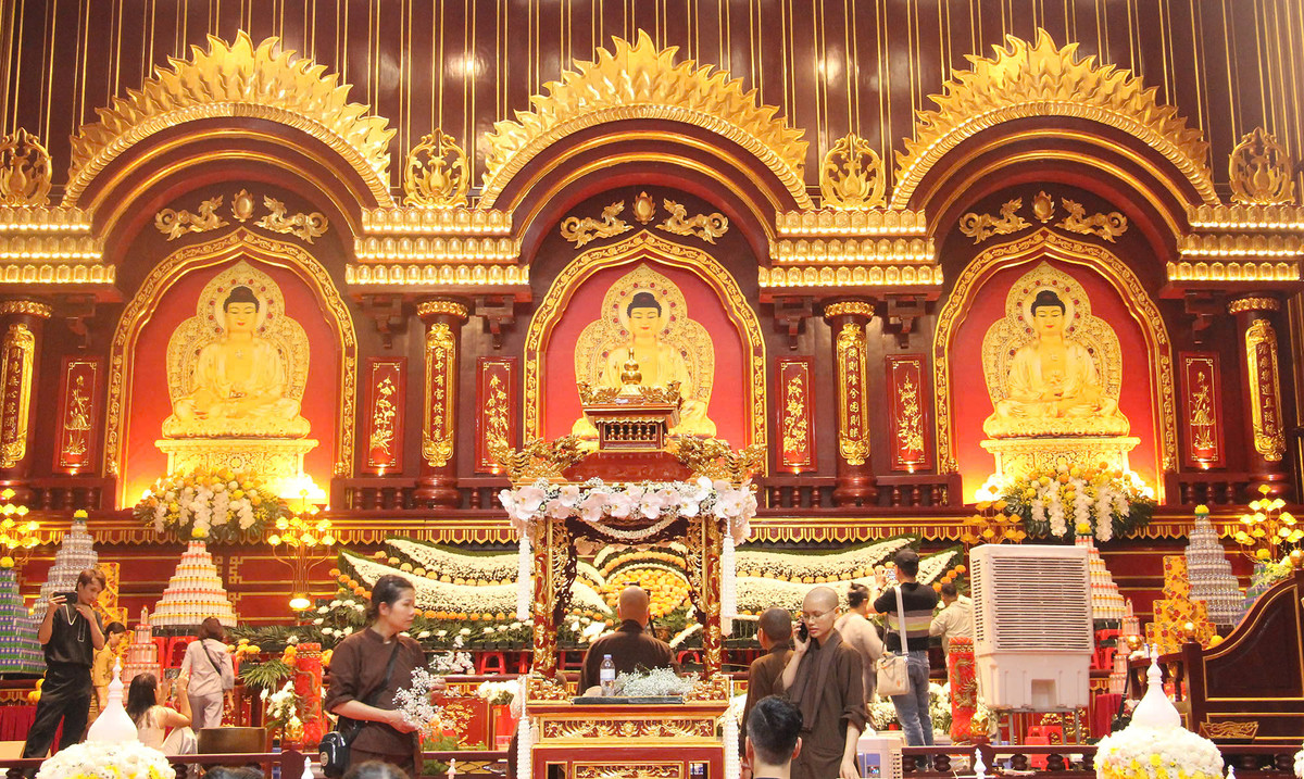 Ban tổ chức và lực lượng tình nguyện viên đang trang trí lễ đài nơi tôn trí xá lợi Đức Phật.