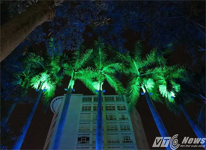 Hàng cau vua được chiếu sáng bởi một dàn đèn màu xanh huyền ảo