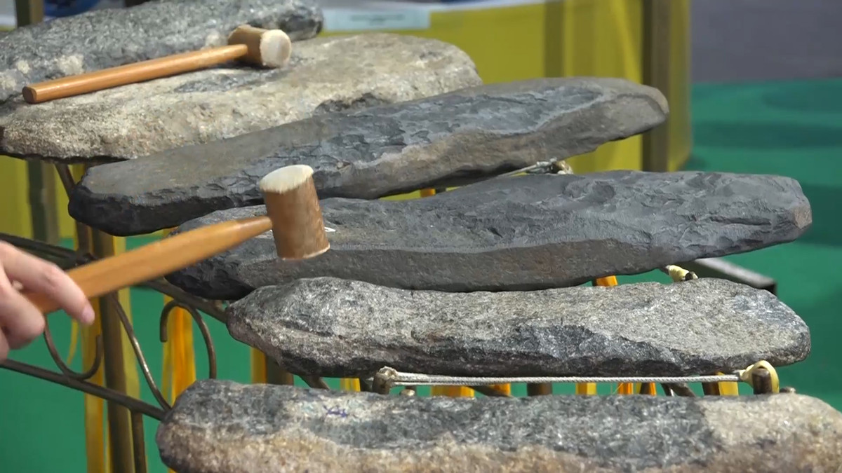 Bộ đàn đá có 8 thanh, niên đại hơn 2.500 năm được tỉnh Phú Yên mang đến Ngày hội Văn hóa du lịch tỉnh Bạc Liêu, thu hút sự quan tâm của nhiều người.