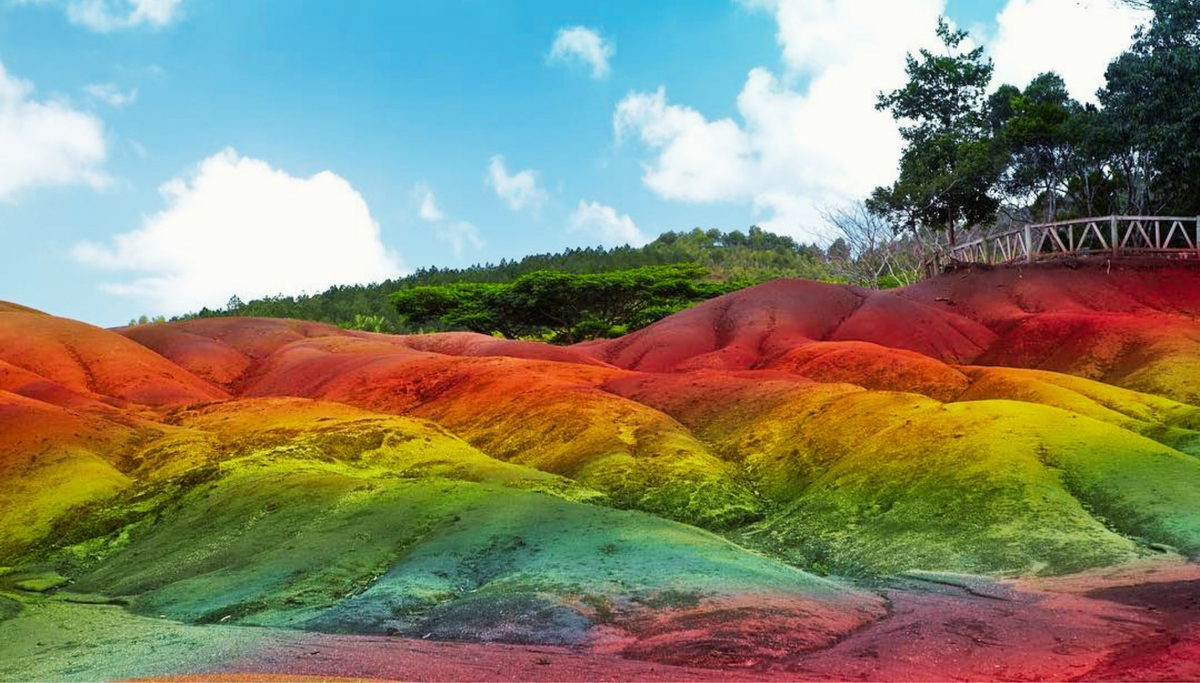 Địa danh Seven Coloured Earth nằm gần ngôi làng Chamarel, đảo quốc Mauritius, miền Tây Nam Ấn Độ Dương được biết đến bởi những dải đất và đụn cát với những sắc màu độc đáo: màu nâu đỏ, tím, xanh lá cây, xanh dương, tím và màu vàng.