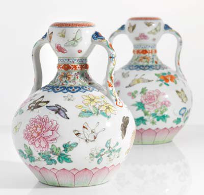 Chiếc bình được trang trí công phu với những cánh bướm bay lượn nhẹ nhàng giữa những bông hoa được tráng bằng màu sắc tươi sáng. Với lối thiết kế phức tạp bởi màu sắc nổi bật của hoàng gia như màu vàng và đỏ, cặp bình truyền đạt sự sung túc và sự giàu có lâu dài.