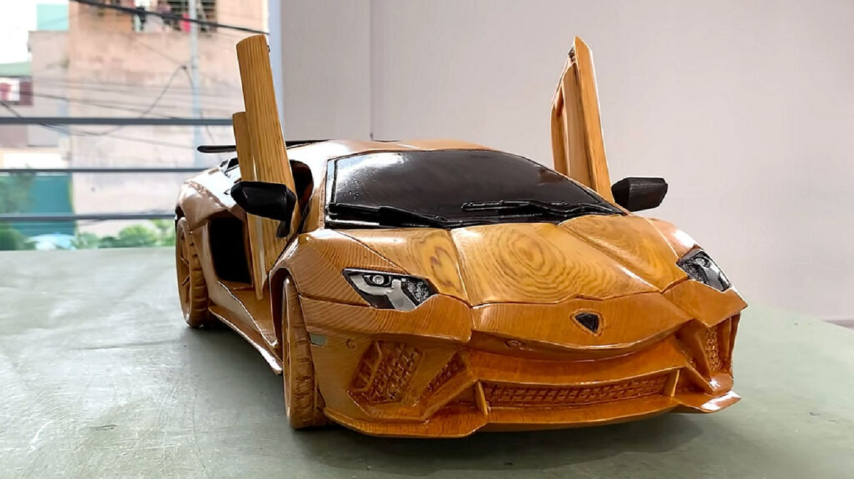 Chiếc Lamborghini Aventador S 2021 tí hon của nghệ nhân ở Hà Nội được làm từ gỗ nguyên khối, tỉ mỉ tới từng bộ phận như các đường chỉ trên lốp hay hoa văn trên la-zăng. Ghế ngồi, vô lăng, gương cửa...đều được làm rời rồi lắp vào xe. Nắp ca-pô và cánh cửa có thể mở lên như xe thật. Mô hình Lamborghini Aventador S 2021 bằng gỗ được nghệ nhân thiết kế theo tỷ lệ 1:13.