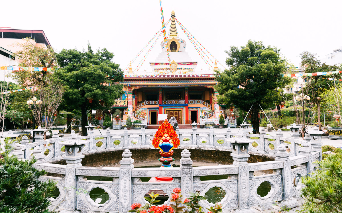 Bước vào điện thờ bên trong, ngước lên trên, du khách sẽ thấy trần nhà được trang trí theo phong cách Kim cương thừa điển hình. Còn các họa tiết được thiết kế tỉ mỉ, tinh xảo với những vòng tròn mandala - biểu tượng quan trọng trong pháp môn Mật tông Kim cương thừa.