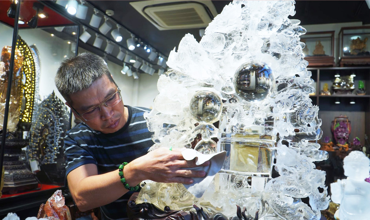 Gần 10 năm sưu tập, anh Trần Huy Doanh (ngụ quận Phú Nhuận,TP.HCM) sở hữu hàng nghìn tác phẩm, sản phẩm từ đá quý các loại. Phòng trưng bày riêng của anh và người bạn đồng hành Trần Duy Khoa có nhiều tác phẩm chạm khắc đá thạch anh rất tinh xảo.