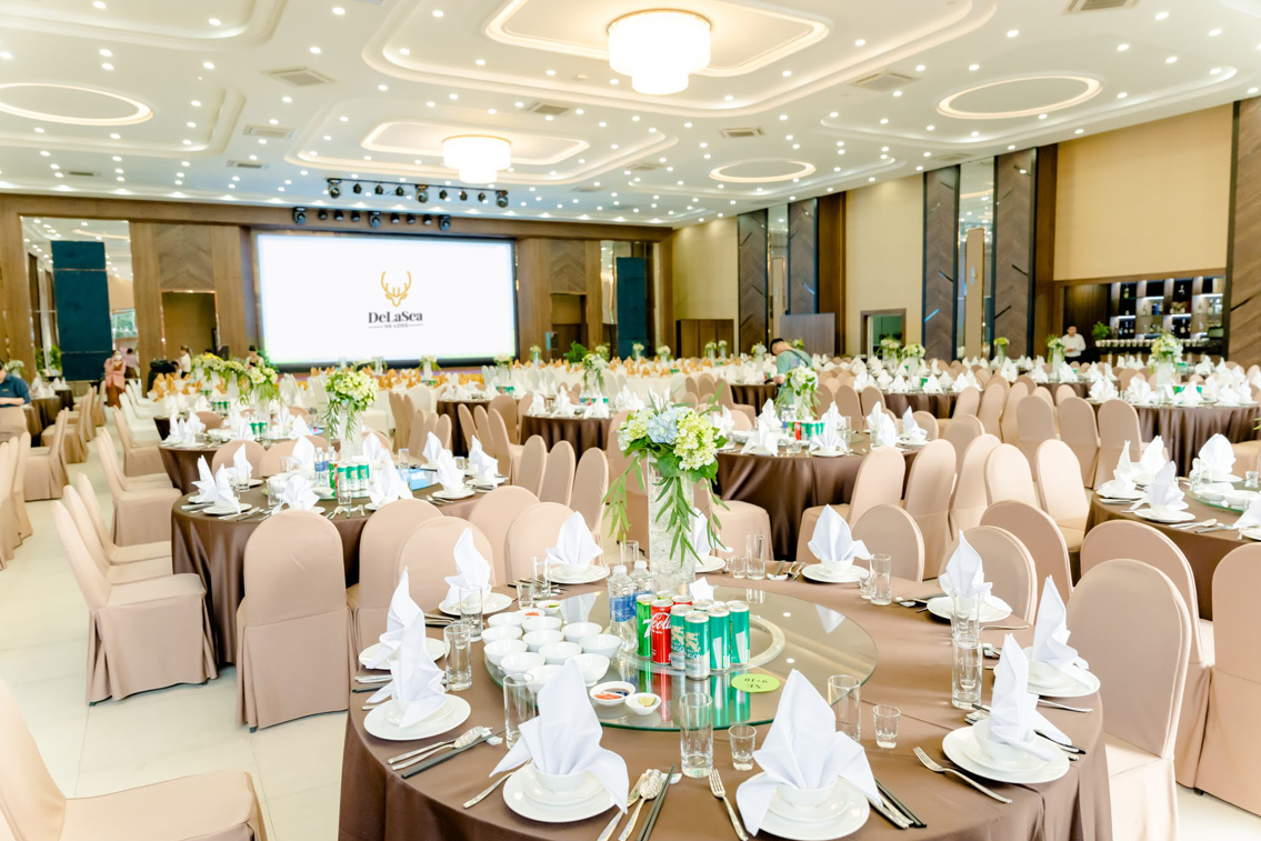 Gói tiệc tại DeLaSea Ha Long Hotel miễn phí nhiều dịch vụ: âm thanh, ánh sáng, màn LED hiện đại, bánh cưới, khánh tiết chào mừng, MC cho gói 350.000++/ khách và tặng thêm live band hoặc nhóm múa cho gói 750.000++/khách.