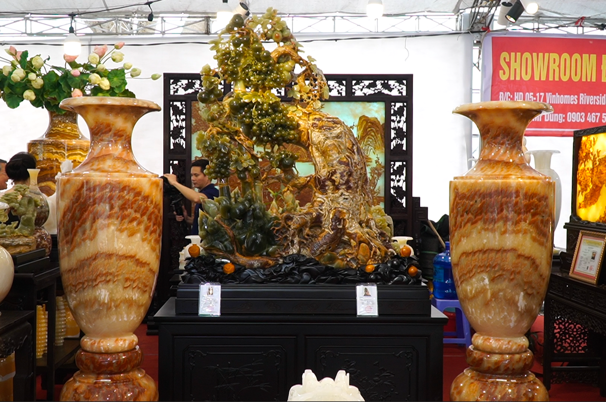 Nghệ nhân Tô Chinh (Hà Nội) chế tác “cây nho già” từ ngọc Onyx nguyên khối, theo dáng cổ lão phát tinh hoa, dáng trực đầu rồng.