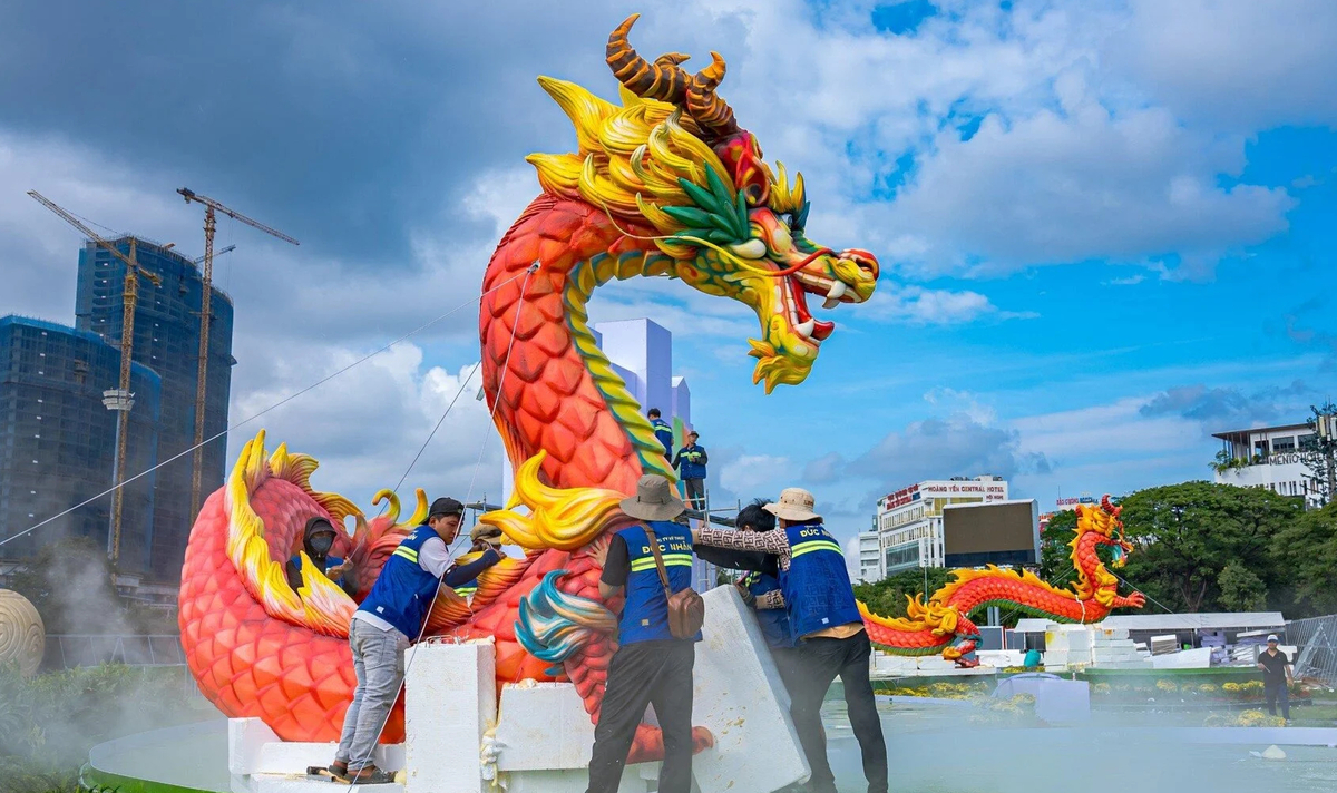 Ngày 28/1, các công nhân vẫn đang khẩn trương hoàn thiện khu trưng bày biểu tượng linh vật rồng mừng xuân Giáp Thìn 2024 tại quảng trường Nguyễn Tất Thành, TP Quy Nhơn, Bình Định.