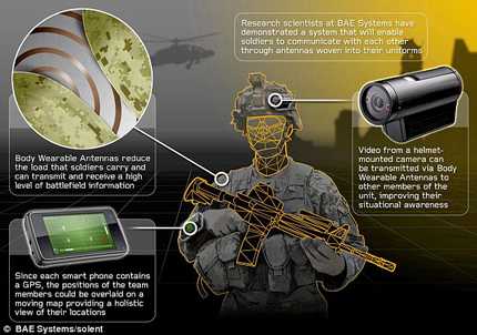 Công nghệ mới được tích hợp trên đồng phục quân sự, bao gồm một hệ thống camera gắn trên mũ bảo hiểm, kết hợp với định vị GPS và khả năng điều khiển bằng giọng nói, giúp người lính “đồng bộ” con mắt với các đồng đội của mình, hệ thống này có thể làm việc trong nhiều điều kiện môi trường khắc nghiệt.