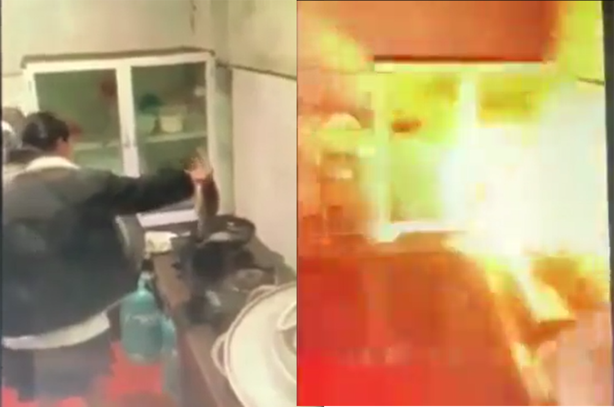 Thao tác cho cá vào chảo đầy vụng về của cô gái đã khiến chảo nghiêng và đổ mỡ xuống bếp khiến lửa bùng lên sáng rực. Tiếng la hét phát ra từ trong video như muốn nói lên nỗi lo sợ của người xem trước cảnh hãi hùng này.