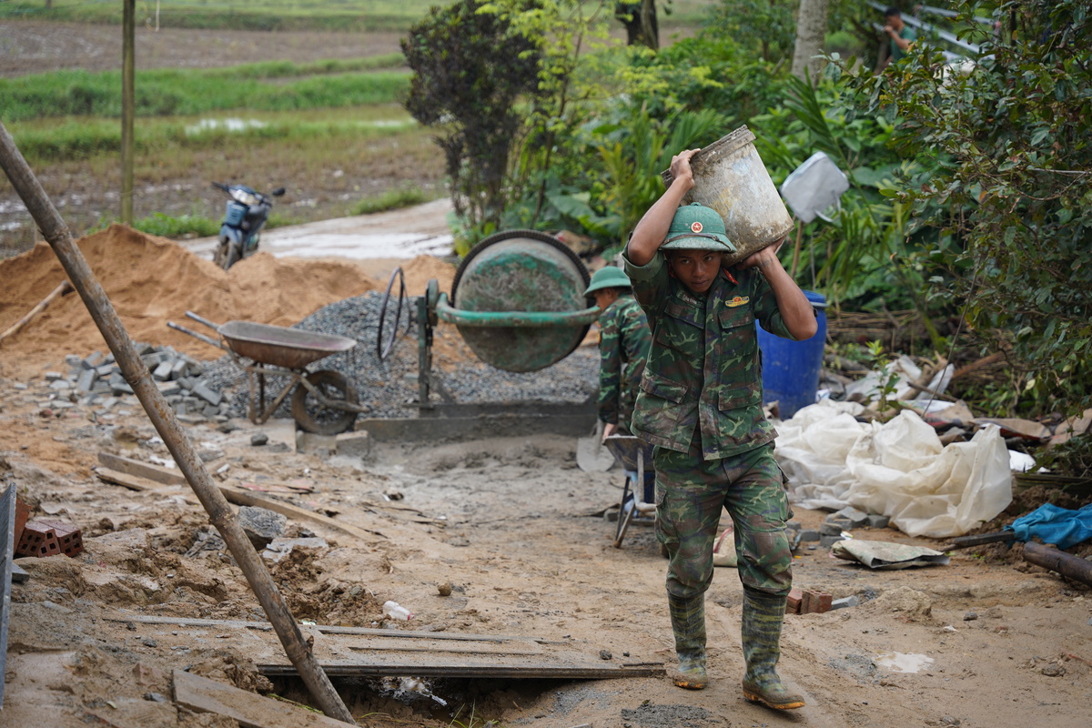 Những ngày đầu tháng 12, khi đoàn xe quân đội chở vật tư tiến vào thôn Phú Hữu, nhiều người dân tò mò đứng dọc hai bên đường. Trên nền đất còn lổn nhổn gạch vỡ, cây đổ, các chiến sĩ nhanh chóng phân công công việc, người đo đạc, dựng cột; người trộn hồ, xây tường; người đan sắt, kiểm tra từng chi tiết. Mỗi khâu đều được làm cẩn trọng, chính xác, không qua loa.
