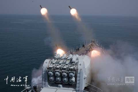 | Tàu khu trục tên lửa Thanh Đảo nhả đạn - Ảnh: Chinamil |