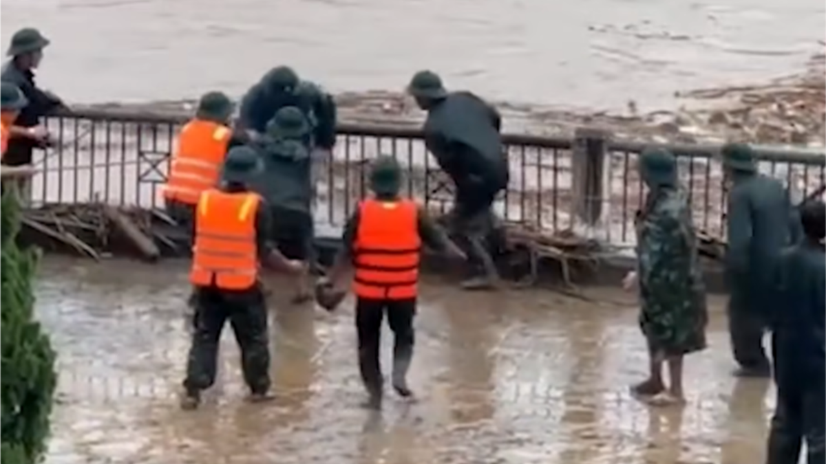 Một chiến sĩ bộ đội đã bị kéo rơi xuống dòng sông đang chảy xiết khi tìm cách ngăn chặn sà lan trôi dạt đâm vào cầu Cốc Lếu - TP Lào Cai.