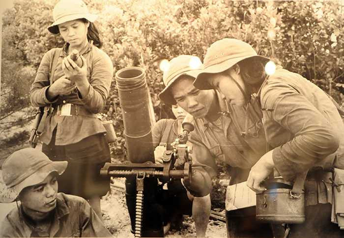 Đội dân quân pháo binh xã Trung Giang – Gio Linh bao vây quân Nam Việt Nam cố thủ trong thành phố Cồn Tiên. Chị Lan, bên phải ảnh, là đội trưởng. Chị hy sinh trong cuộc chiến năm 1972. (Ảnh: Đoàn Công Tính, phần chú thích ảnh của tác giả được giữ nguyên)