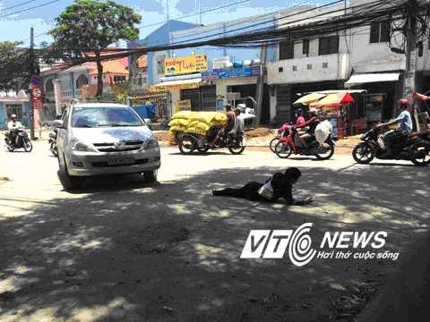 | Đối tượng được HLV dạy phải lăn lê, bò lết trên đường trông tội nghiệp, người đi đường thấy vậy ghé đến mua vé số, cho thêm tiền. Ảnh: Huy Phan |