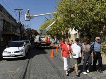 | Những người dân Talca vẫn ở ngoài đường trong khi các công nhân đang sửa chữa đường dây cấp điện sau động đất. |