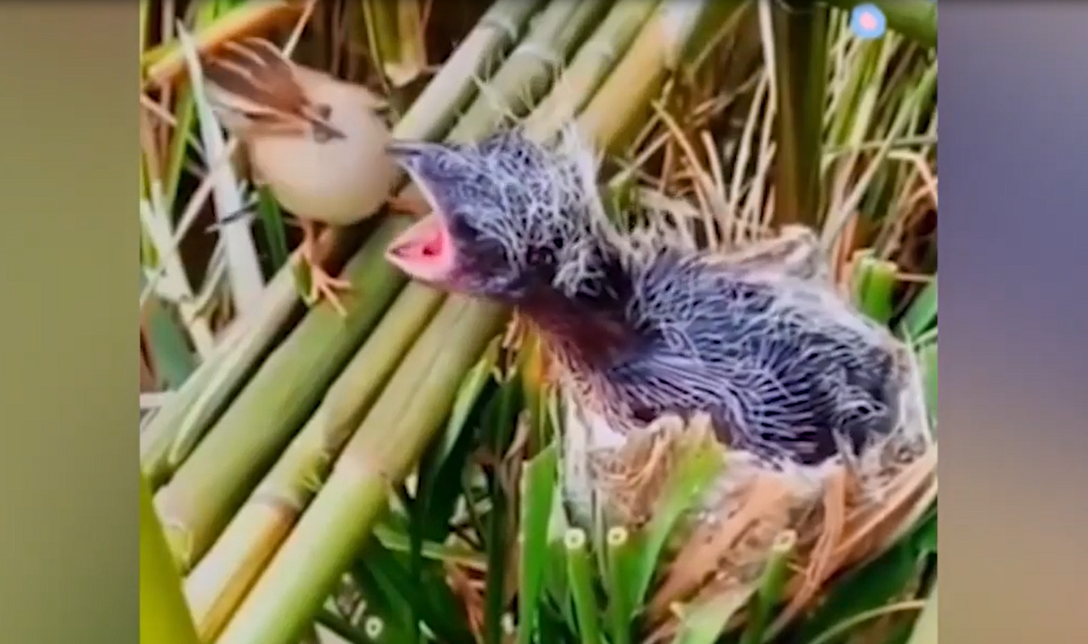 Mang mồi về tổ để nuôi con, chim mẹ bỗng rụt người lại vì hoang mang khi thấy chú chim non lớn gấp mấy lần mình đang há mỏ.
