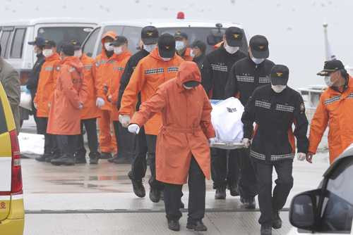 | Lực lượng cứu hộ Hàn Quốc đưa thi thể một hành khách vừa tìm thấy lên bờ |